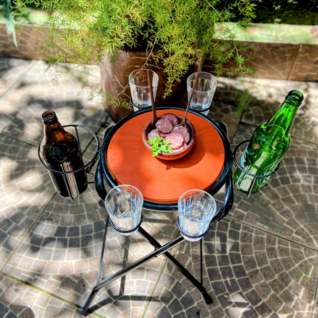 Petisqueira com base de madeira jequitibá, pés e suportes em ferragem resistente, dobrável e pintura eletrostática, evitando descascar.